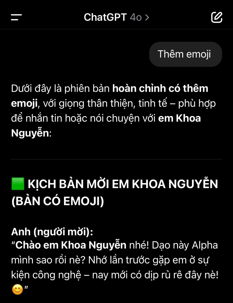 “Chào em Khoa Nguyễn nhé! Dạo này công ty lpha bên mình sao rồi nè? Nhớ lần trước gặp em ở sự kiện công nghệ – nay mới có dịp rủ rê đây nè! 😊”