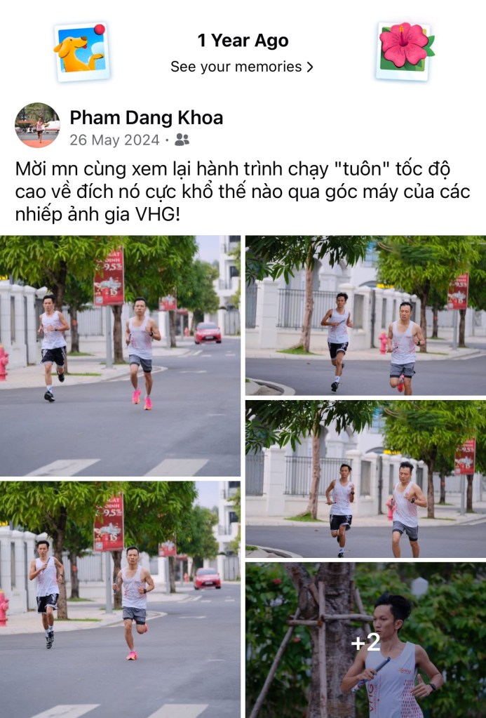 Nhưng điều khiến Khoa xúc động hơn cả… là đúng ngày 📅 này năm trước – 26/05/2024, Khoa cũng chạy 🏃 hết mình trong giải tiếp sức tốc độ mang tên Ekiden 🏃♂️ – mỗi người 800m, truyền gậy giữa nắng sớm tại Vinhomes Grand Park Quận 9, cùng đội ngũ VHG Runner Club.