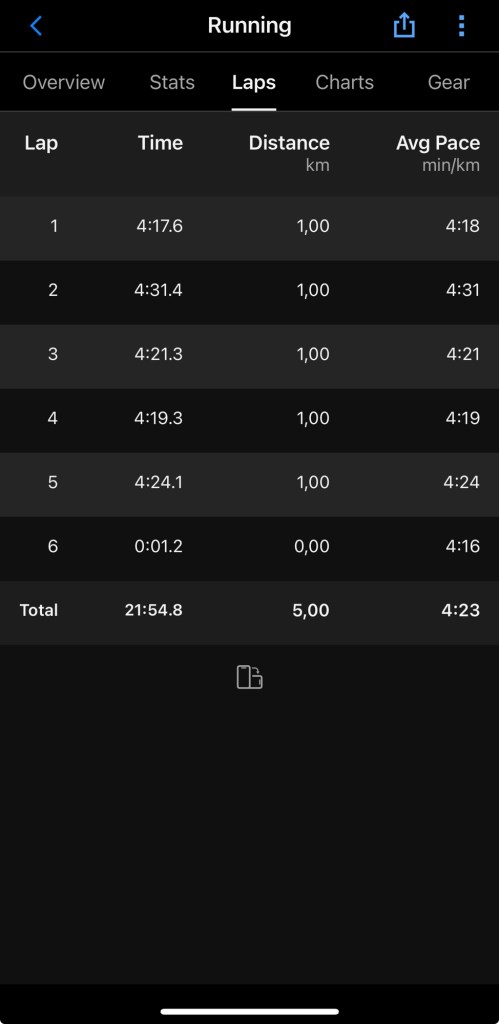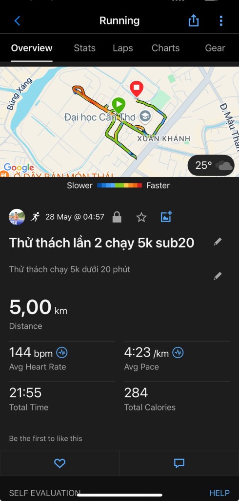 📍5.00km | 🕒 21:55 | ⚡ Pace: 4:23/km | ❤️🔥 Nhịp tim TB: 144 bpm