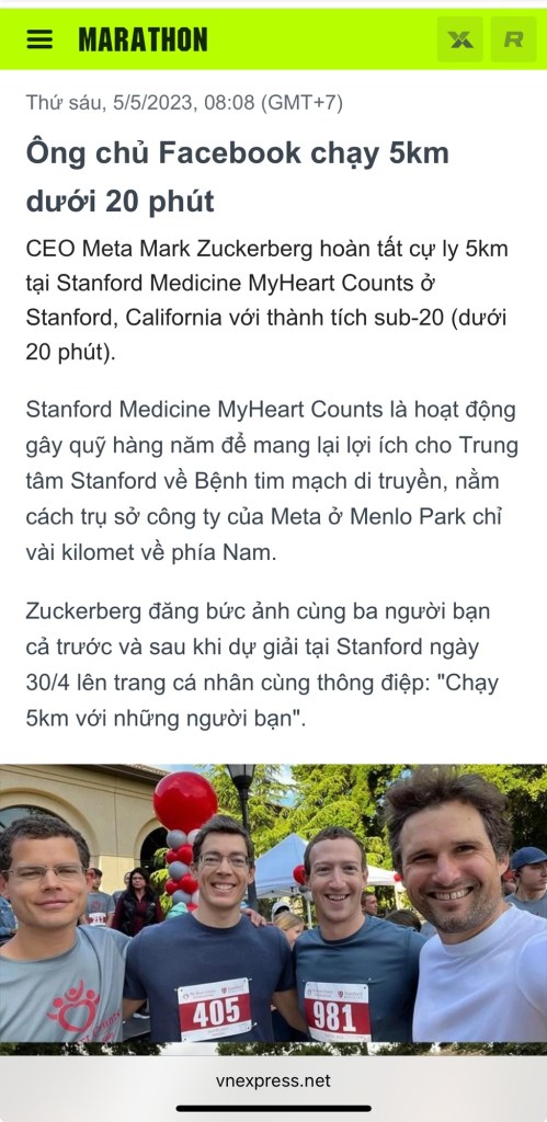 📸 Mark Zuckerberg – ông chủ Facebook – cũng từng chạy 5km sub20 cùng bạn bè ở Stanford 🇺🇸