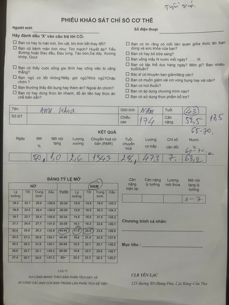 📋 Dựa trên phiếu khảo sát chỉ số cơ thể của anh Khoa, sinh năm 1983, cao 174 cm, nặng 52.5 kg, body fat 17.5%, body water 63.2%, cơ bắp 47.3%, có mục tiêu tăng cân và cải thiện hệ tiêu hóa – dưới đây là kế hoạch sử dụng sản phẩm Herbalife kết hợp ăn uống hợp lý trong 10 bữa (5 ngày, mỗi ngày 2 bữa chính):