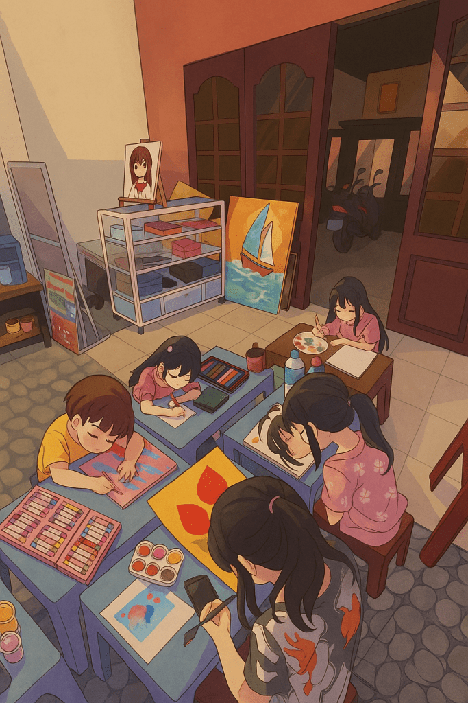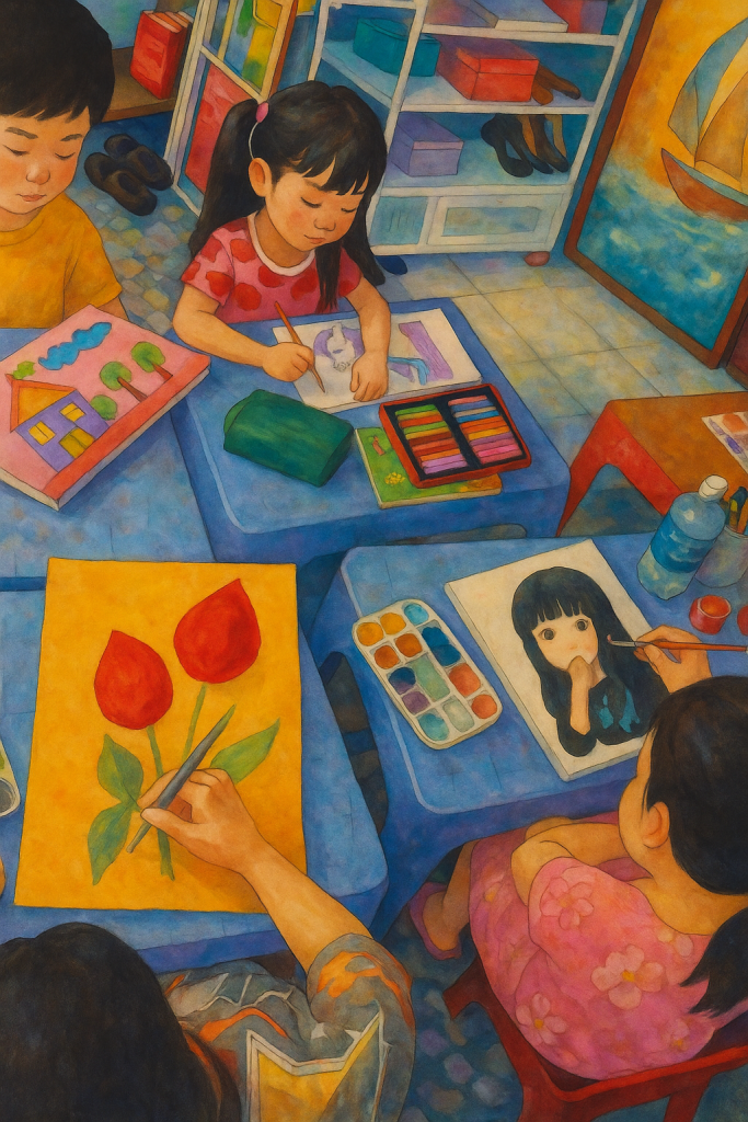 Việc đưa con đi học vẽ, rèn tính sáng tạo và khả năng quan sát 👀 không chỉ giúp trẻ phát triển tư duy mà còn là tín hiệu môi trường 🌿 mà Khoa cố tình tạo ra để con hình thành thói quen tích cực 🧩 – thay vì ngồi trước màn hình cả buổi sáng.