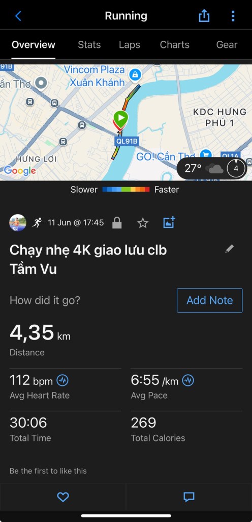 Một buổi chạy nhẹ 4,35km với nhịp độ dễ chịu 🧘♂️, nhịp tim 💓 trung bình 112bpm, thời tiết 27°C mát mẻ – quá lý tưởng để kết nối & chia sẻ 🤝