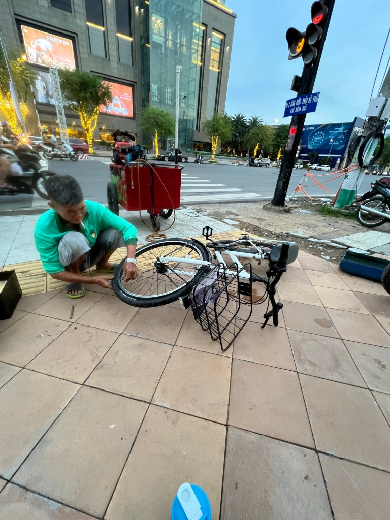 Cười nhẹ 😄. Dắt bộ 🚶. Gặp chú sửa xe hiền lành bên lề đường.
