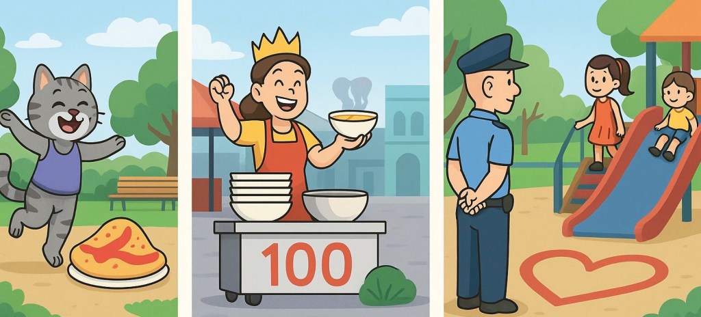 👁 Tưởng tượng: Một chiếc bánh crepe khổng lồ in hình mèo nhảy múa 🐱 trong công viên → Quá incredible!