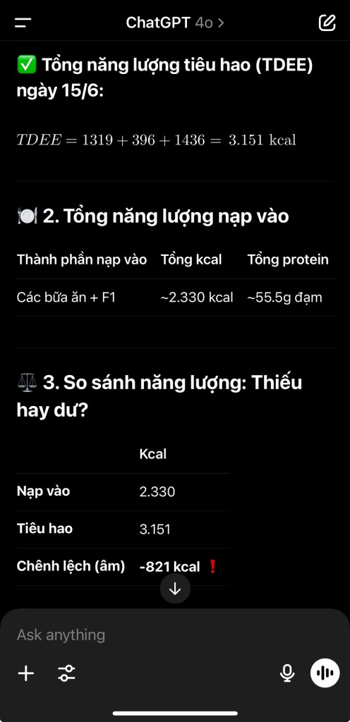 📉 👉 Kết quả: Thiếu hụt 821 kcal