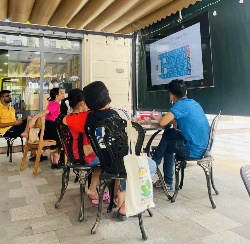 Buổi học diễn ra ngay tại quán cà phê Monaco – với vài chiếc bàn, màn hình TV, 📺 bảng chữ Hiragana và vài tờ giấy viết tay ✍️.