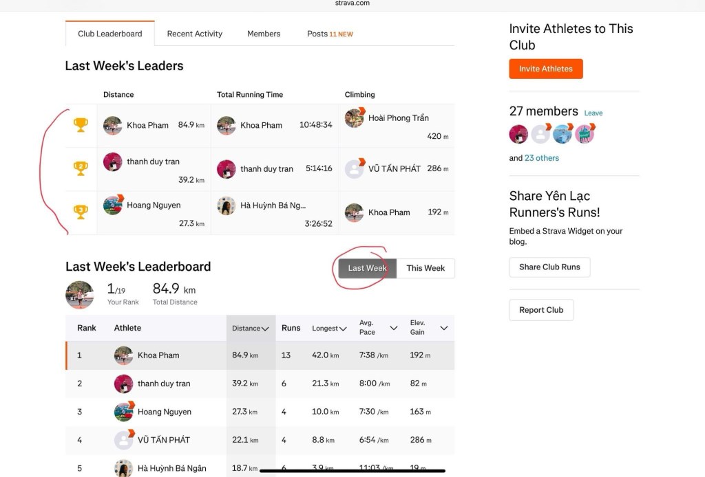 • Nhấn nút “Last Week” để xem số liệu tuần trước → rất phù hợp để tuyên dương người nổi bật hoặc đặt thử thách mới 🎯
