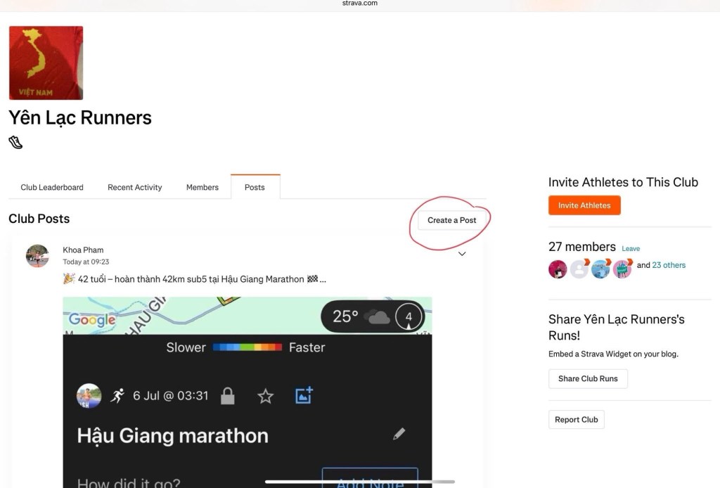 • Nhấn nút “Create a Post” ➕ để đăng bài chia sẻ: cảm xúc sau race, ảnh check-in, rủ rê đồng đội chạy bộ 🏃♂️ cùng 👟
