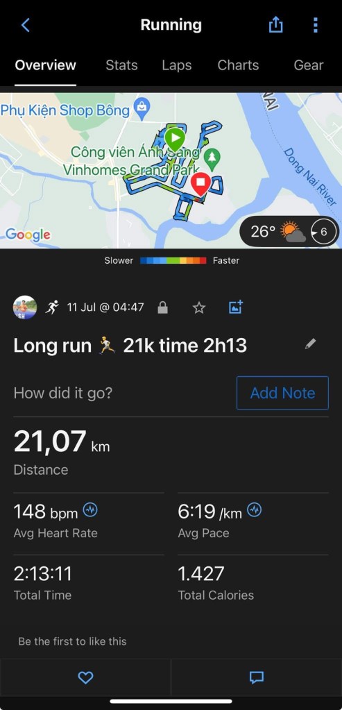 🔥 Vẫn còn nhớ rõ 2km cuối, từng bước chạy 🏃 chậm dần (pace ~7:40) – như một lời nhắc nhẹ từ cơ thể rằng: