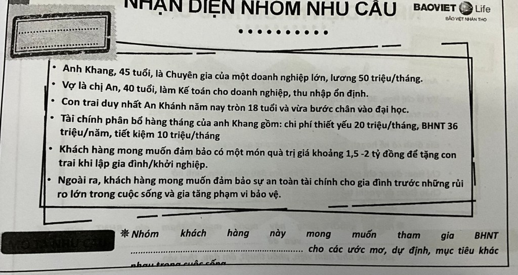 • Mong muốn: dành tặng con món quà tài chính trị giá 1.5–2 tỷ và bảo vệ an toàn tài chính cho gia đình trước rủi ro - Nhu cầu ưu tiên: