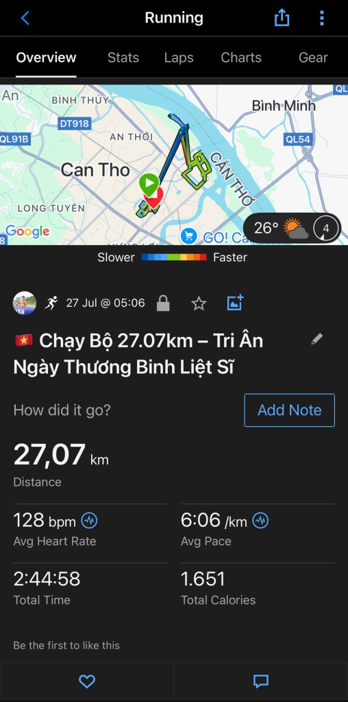 Sáng nay, Khoa hoàn thành chặng chạy 🏃 27.07km – một con số tượng trưng cho ngày Ngày Thương binh, Liệt sĩ 27/7, như một lời tri ân bằng hành động, chứ không chỉ bằng lời nói.