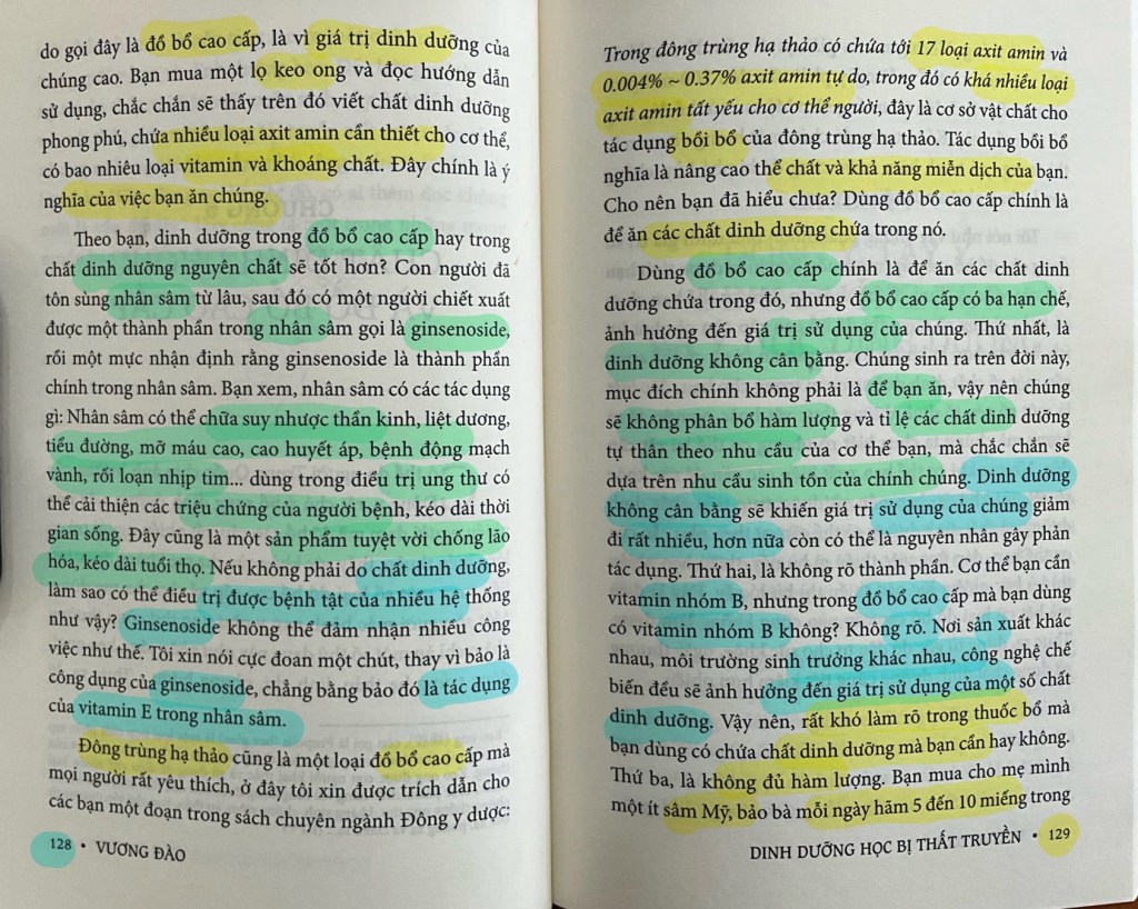 Tác giả cảnh báo về việc lạm dụng các loại “đồ bổ cao cấp” như nhân sâm, linh chi, nhung hươu, 🦌 đông trùng hạ thảo… vốn chỉ phù hợp khi có bệnh 🦠 lý cụ thể. Chúng chứa dưỡng chất quý, nhưng không thể thay thế các chất dinh dưỡng nền tảng trong thực phẩm thường ngày 🌾🥦. - Giá trị thực sự nằm ở thành phần vi lượng & nguyên chất 💎