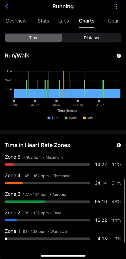 • 🟢 Zone 3 (Aerobic 127–144 bpm): 48% thời gian → tối ưu cho chạy dài rèn nền tảng.