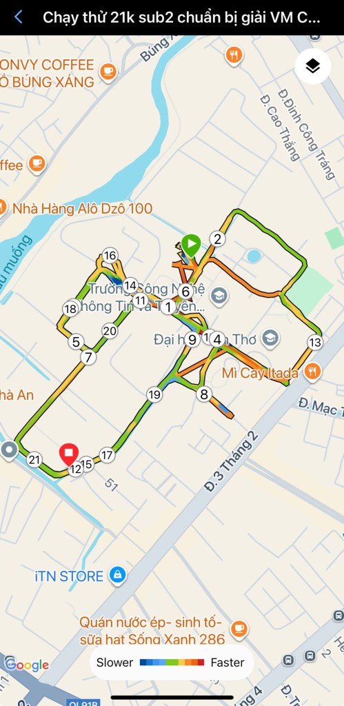 • 📍 Chạy 🏃 vòng quanh khu vực Đại học Cần Thơ – Xuân Khánh, tận dụng đường phẳng để giữ pace đều và mô phỏng điều kiện giải VM Cần Thơ.