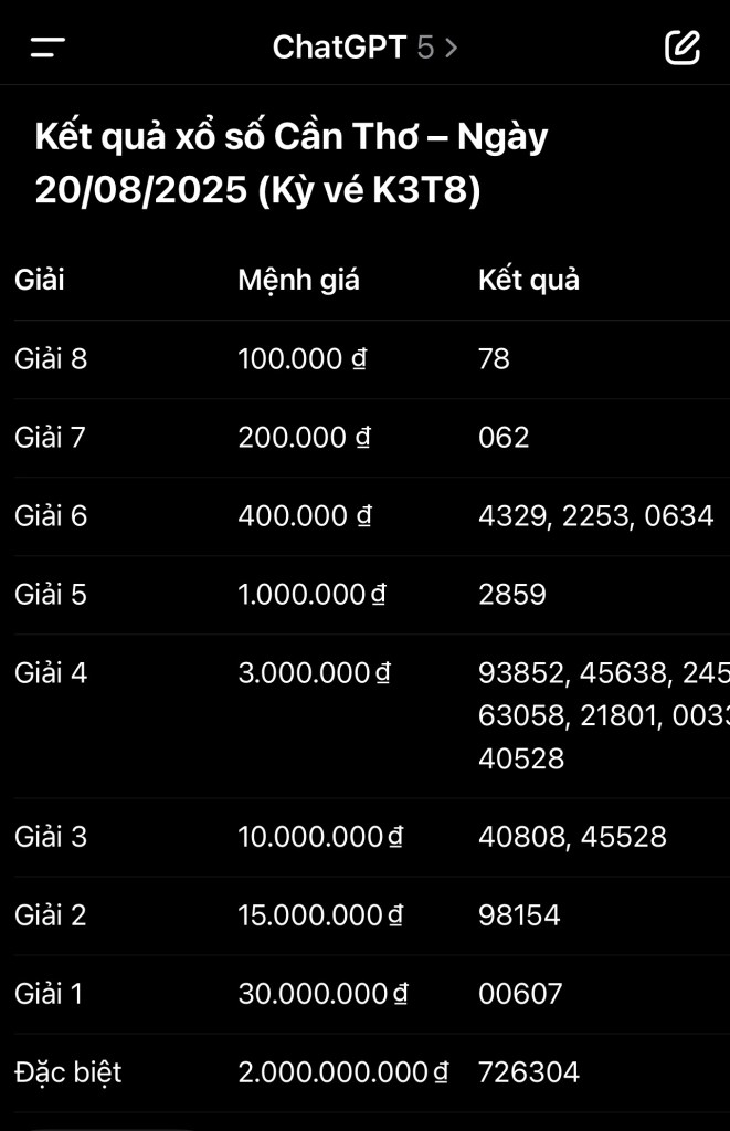 Khoa vừa thử với vé số Cần Thơ kỳ K3T8 (20/08/2025) 👉 ChatGPT dò ngay và báo chi tiết từ Giải 8 đến Giải Đặc biệt.