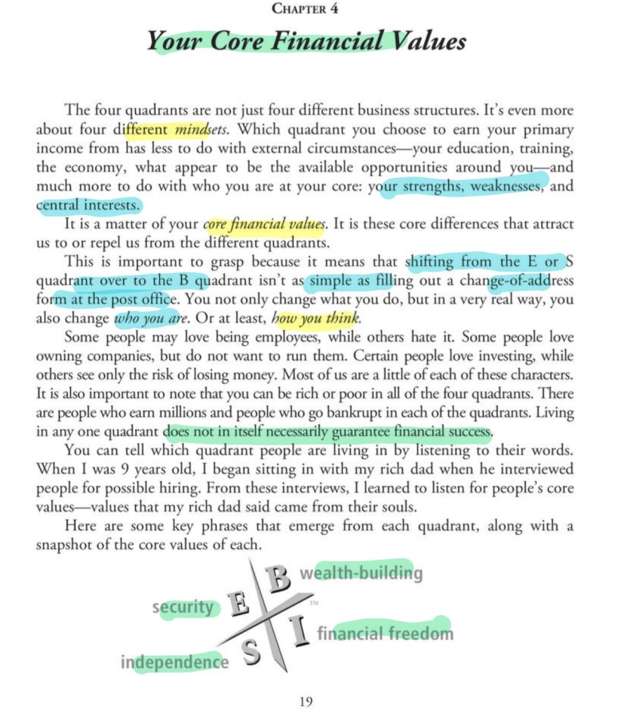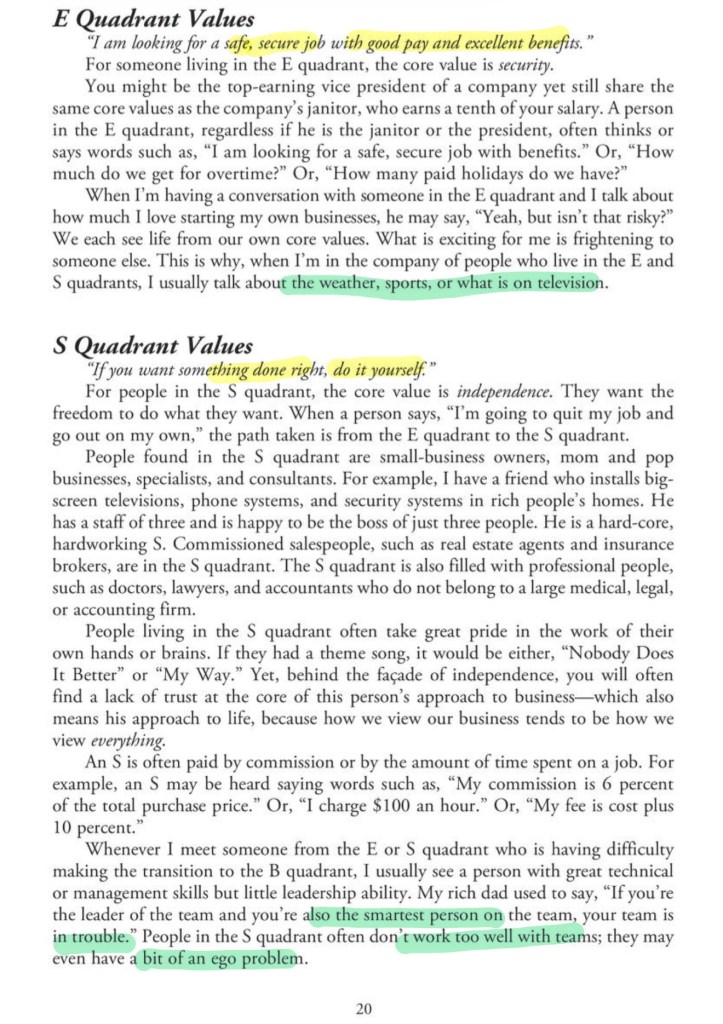 👉 Giá trị cốt lõi quyết định bạn thuộc nhóm thu nhập nào. - Shifting from E or S to B quadrant requires changing how you think, not just what you do.