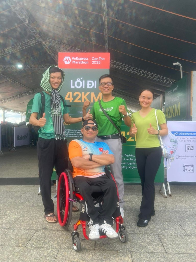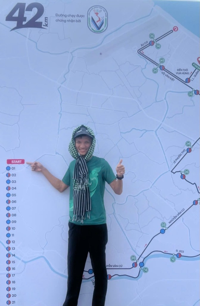 Tháng 4/2025 ở Trà Vinh – lần đầu tiên Khoa chạy full marathon 42km. Mục tiêu 🎯 duy nhất: hoàn thành. Và Khoa đã giữ trọn lời hứa đó, không bỏ cuộc, dù phải mất tới 6 giờ 30 phút và mệt 🤧 rã rời.