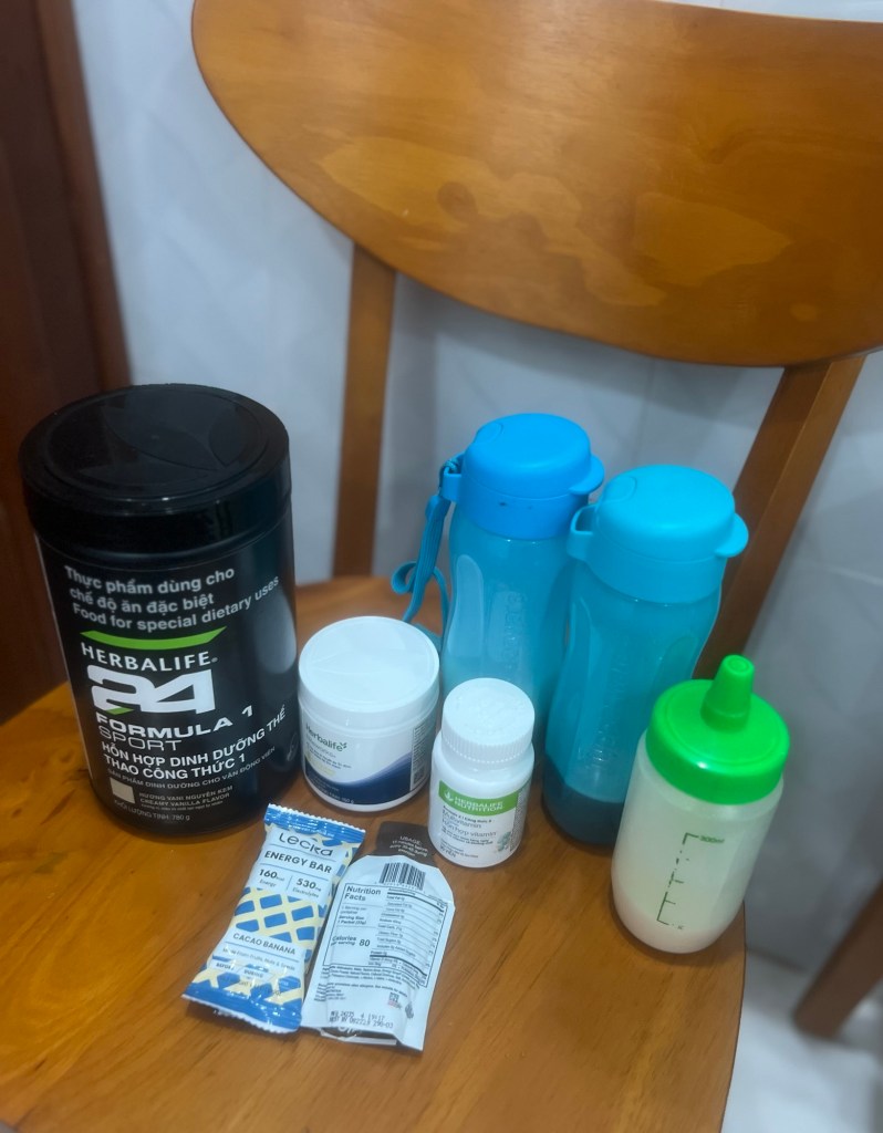 • Tiếp năng lượng: mỗi 7–8 km 1 gel; điện giải 30–40’/lần; uống nước ở mọi trạm.