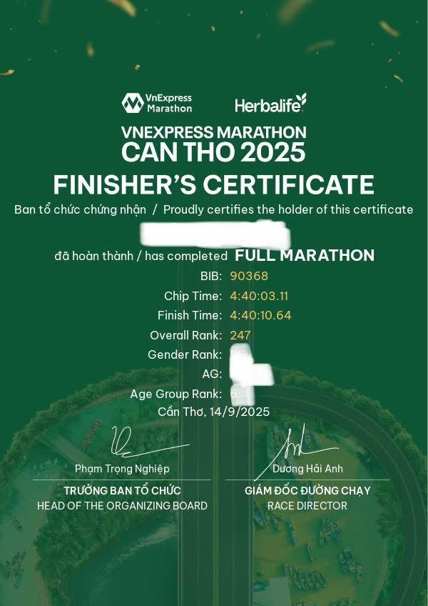 Chỉ hai tháng sau – ngày 14/9 tại VNEXPRESS Marathon Cần Thơ 2025, Khoa tiếp tục thử thách bản thân: sub5 một lần nữa để chứng minh đó không phải ăn may. Và lần này, với sự chuẩn bị kỹ lưỡng hơn cả về thể chất (tăng cân thêm 2kg) và tinh thần (ngủ sớm đúng giờ) 👉 Khoa đã hoàn thành ☑️ với thành tích 4:40:23 ⏱️.