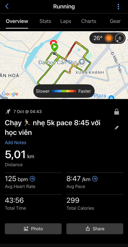 Sáng nay, Khoa cùng học viên hoàn thành buổi chạy nhẹ 5km pace 8:45, vòng quanh khuôn viên Đại học Cần Thơ.