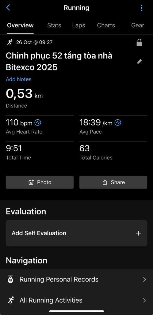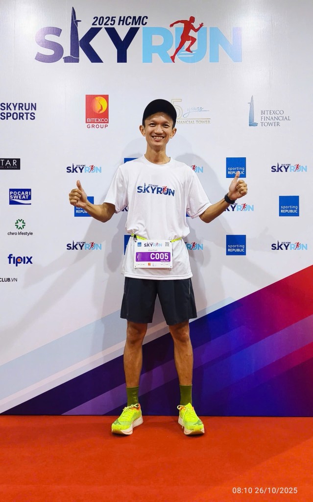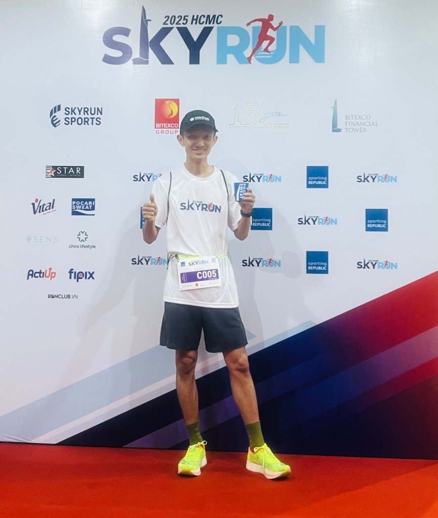 “Bitexco SkyRun 2025 – 52 tầng, 9:51 phút, nhịp tim 💗 110 bpm. Một thử thách ngắn nhưng đòi hỏi thể lực, tâm lý và chiến thuật tối ưu – không chỉ leo bằng chân, mà còn bằng ý chí.” 🔥